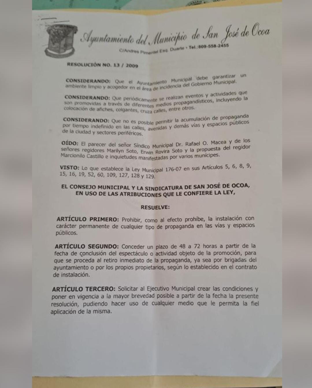 El pasado 7 de mayo de 2024, dando cumplimiento a la resolución municipal 13-2009, el alcalde Fernando Castillo dispuso el retiro de toda la propaganda visual colocada en los espacios públicos del municipio. En ese sentido, otorga un plazo de 3 días a los partidos políticos y sus candidatos, para retirar su propaganda de manera voluntaria; cumplido este plazo, brigadas del ayuntamiento retirarán toda la propaganda que quede en las vías públicas del municipio.