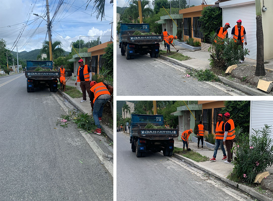 San José de Ocoa. Bajo el cielo nublado, una brigada de la Alcaldía trabaja esta tarde en el embellecimiento de la entrada a San José de Ocoa, en la carretera Padre Billini. Los brigadistas, supervisados por personal de la unidad medioambiental, acondicionan la vegetación, recogen basura y retiran escombros, con la doble finalidad de embellecer la principal entrada al municipio y al mismo tiempo, tomar precauciones ante los esperados aguaceros, evitando así inundaciones urbanas.